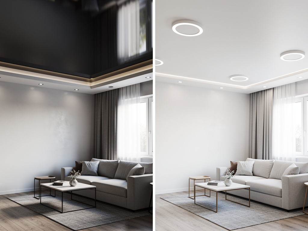 Глянцевый чёрный потолок? Круто в кино, но в жизни — сплошной мрак. Он отражает всё, включая пыль и тени, и высота визуально падает на четверть. А матовый тёмный вообще "съедает" свет, как чёрная дыра.