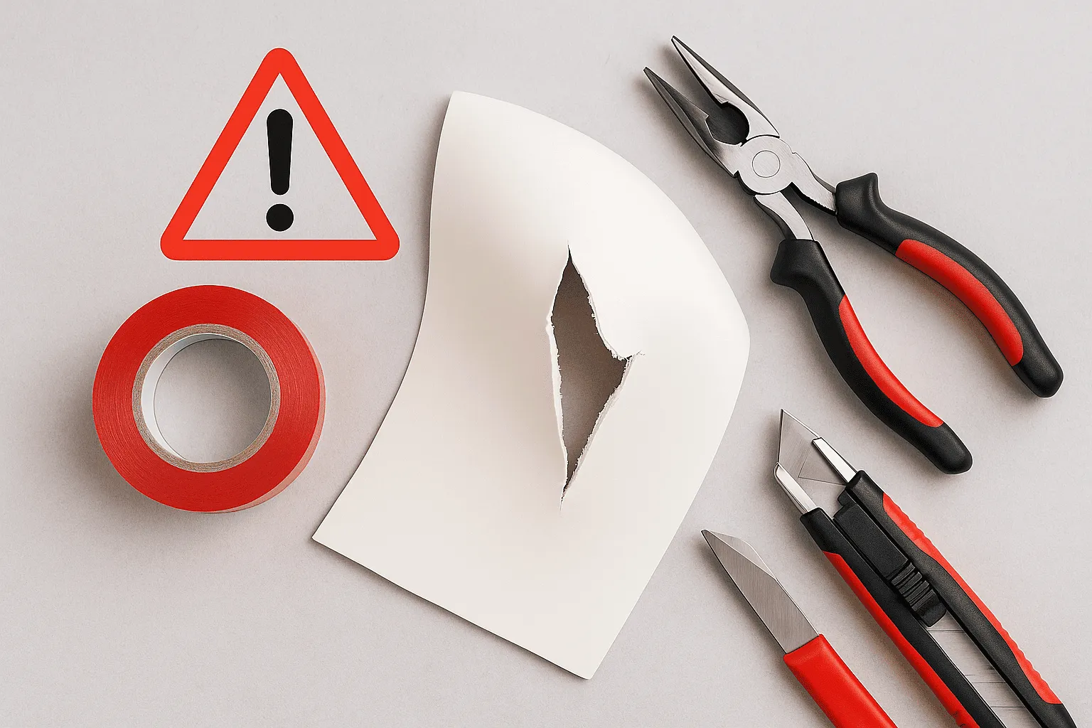 Самая большая ошибка — пытаться заклеить, греть или зашивать полотно без навыков: это почти всегда приводит к увеличению повреждения.