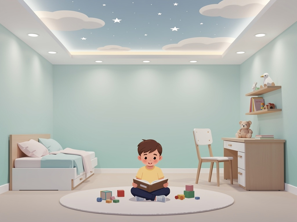Зелёный успокаивает, синий развивает фантазию. Избегайте красного — возбуждает. Градиент от белого к пастели — выигрыш. У нас в портфолио: голубой с облаками для мальчишеской — вырос, стал лёгким техно с подсветкой.