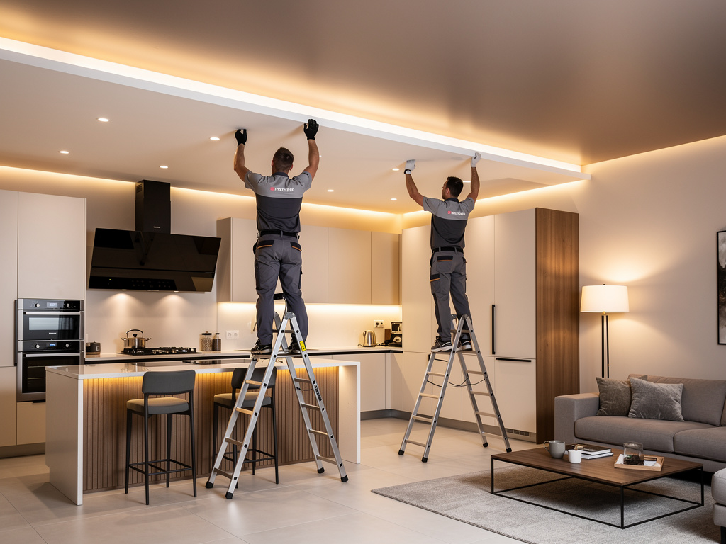 Если вы хотите встроить 10 светильников в потолок кухни-гостиной и добавить светодиодную подсветку по периметру (15-20 м.п.), это может добавить 7000-15000 руб. к общей стоимости.