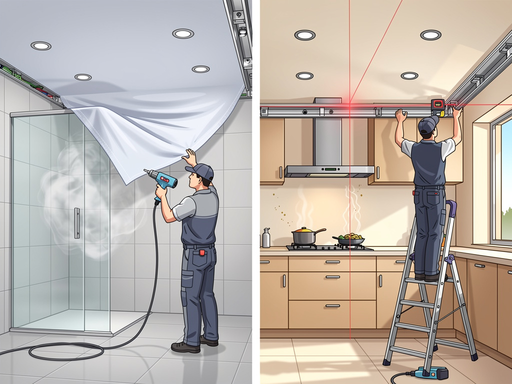 Ванна — это пар, конденсат, плесень на старом потолке. Натяжной спасает: собирает воду при потопе сверху, не даёт ей просочиться вниз. Но! Без правильной подготовки — прощай, идеальный вид.