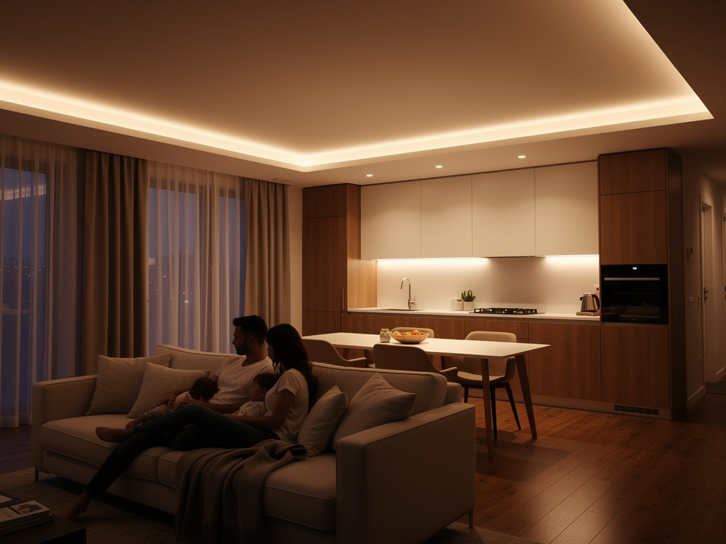 Реальный кейс: семья в новостройке. Хотели глянцевый потолок с подсветкой в кухне-гостиной. Выбрали теплый свет, добавили диммер — регулировка яркости. Бригада приехала утром, уехали вечером. Теперь свет тусклее для ужина, ярче для гостей. Экономия: светодиоды жрут минимум электричества.