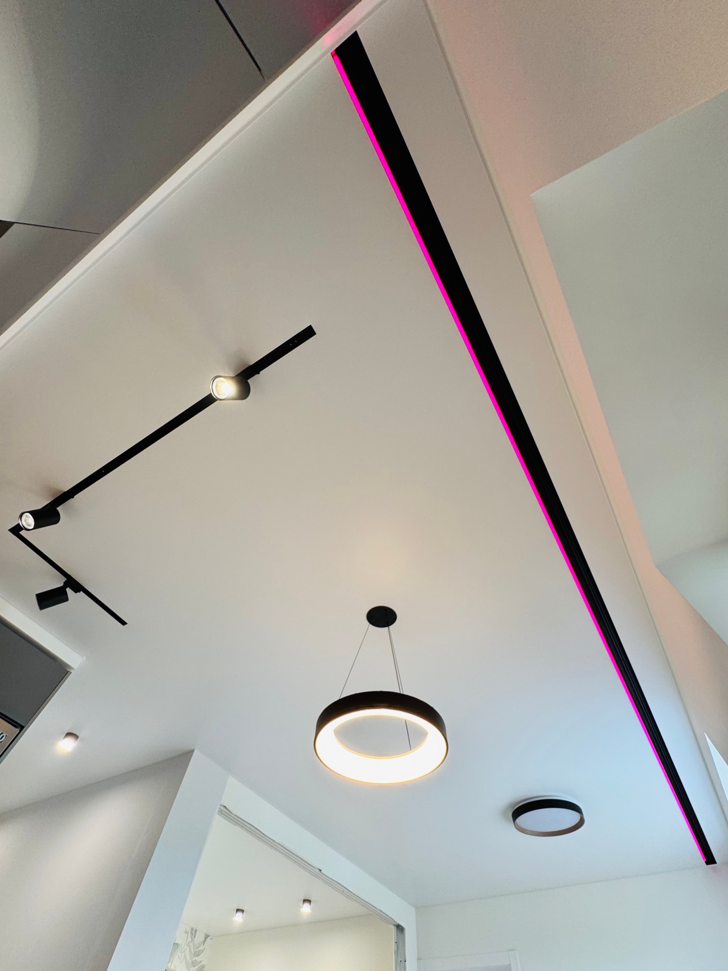 | Трековый | Кухни-гостиные, большие комнаты, современные интерьеры | Гибкость направления света и акцентное освещение | Нужен проект и подготовка еще до натяжки полотна |