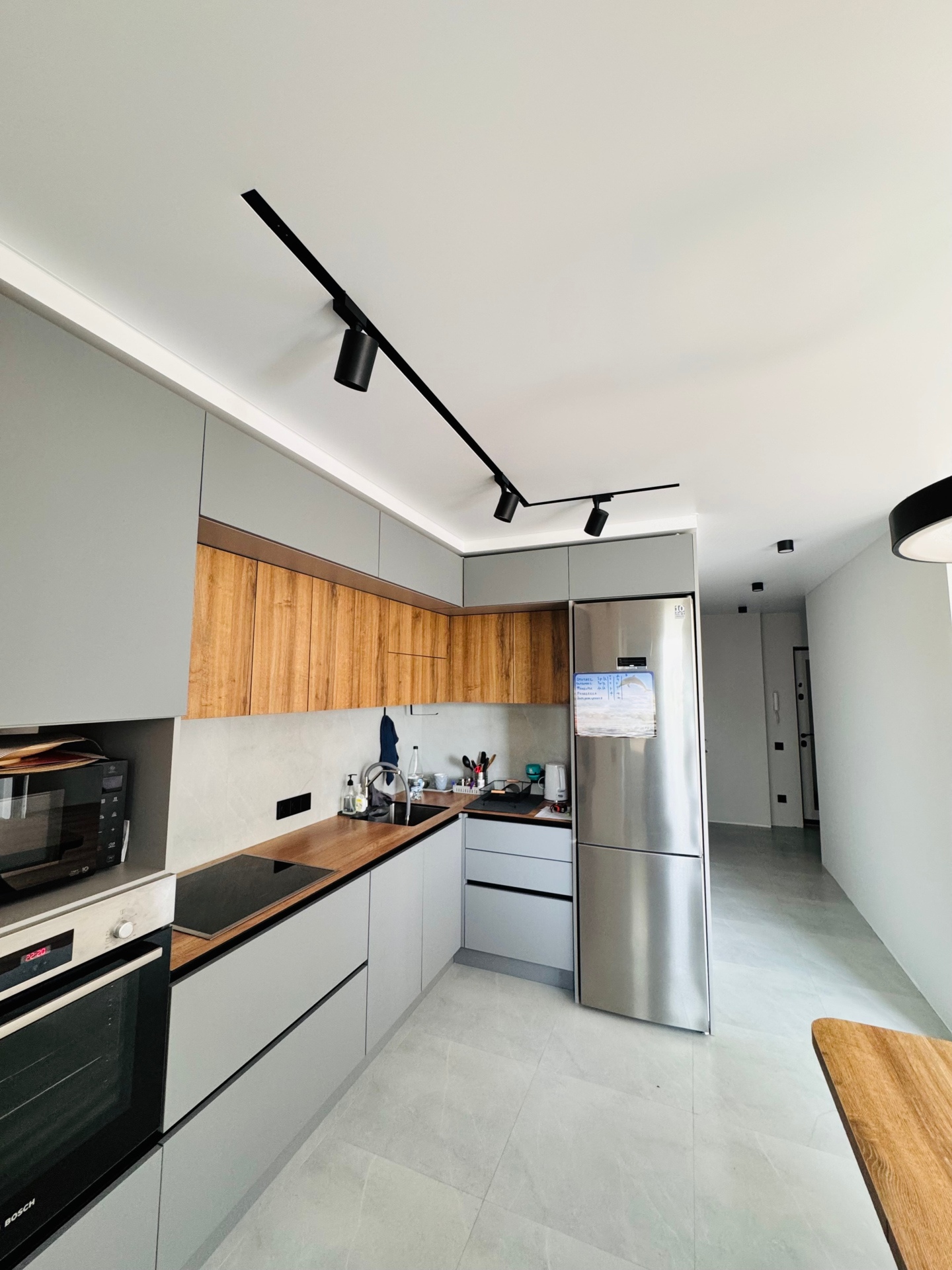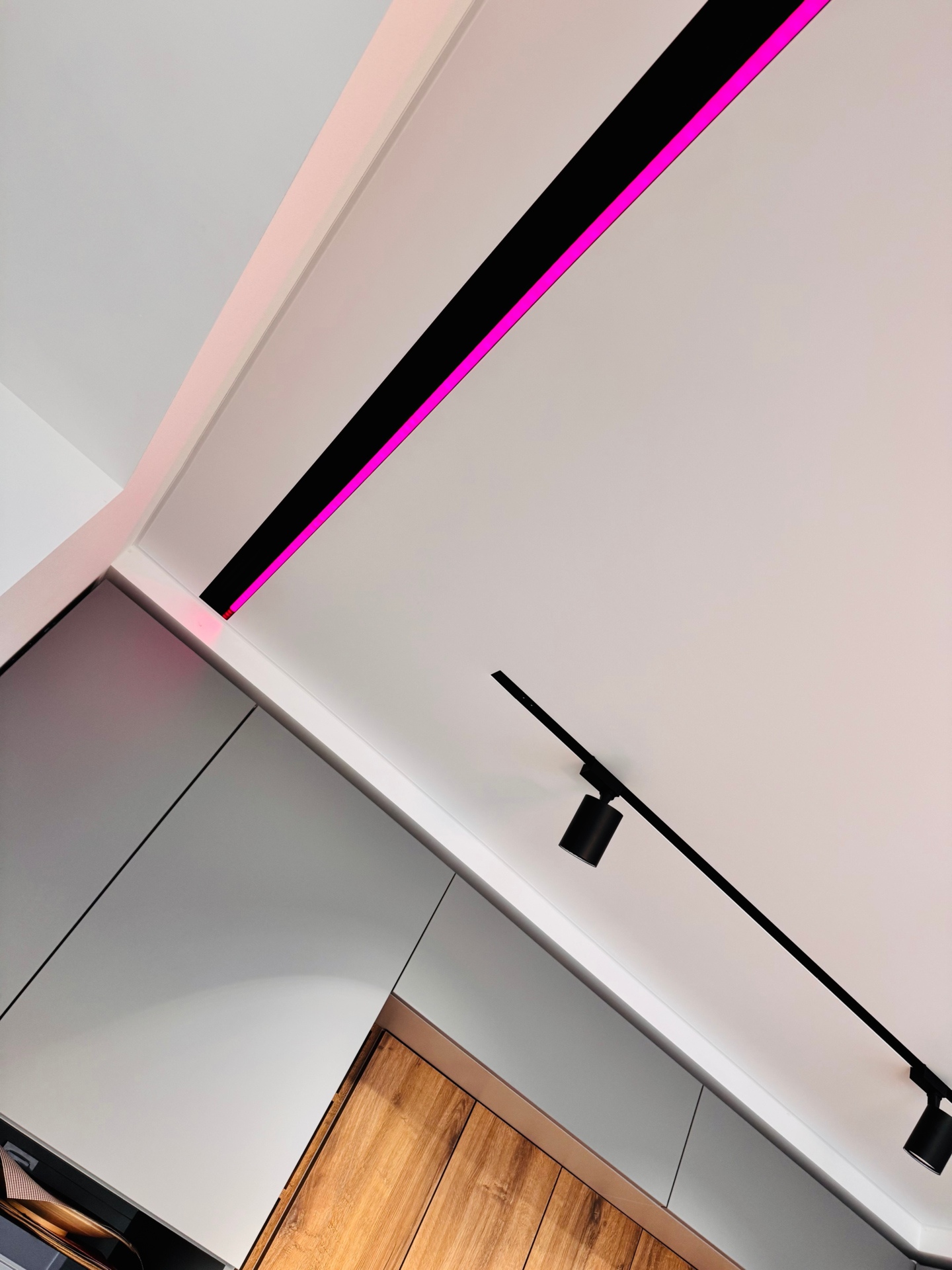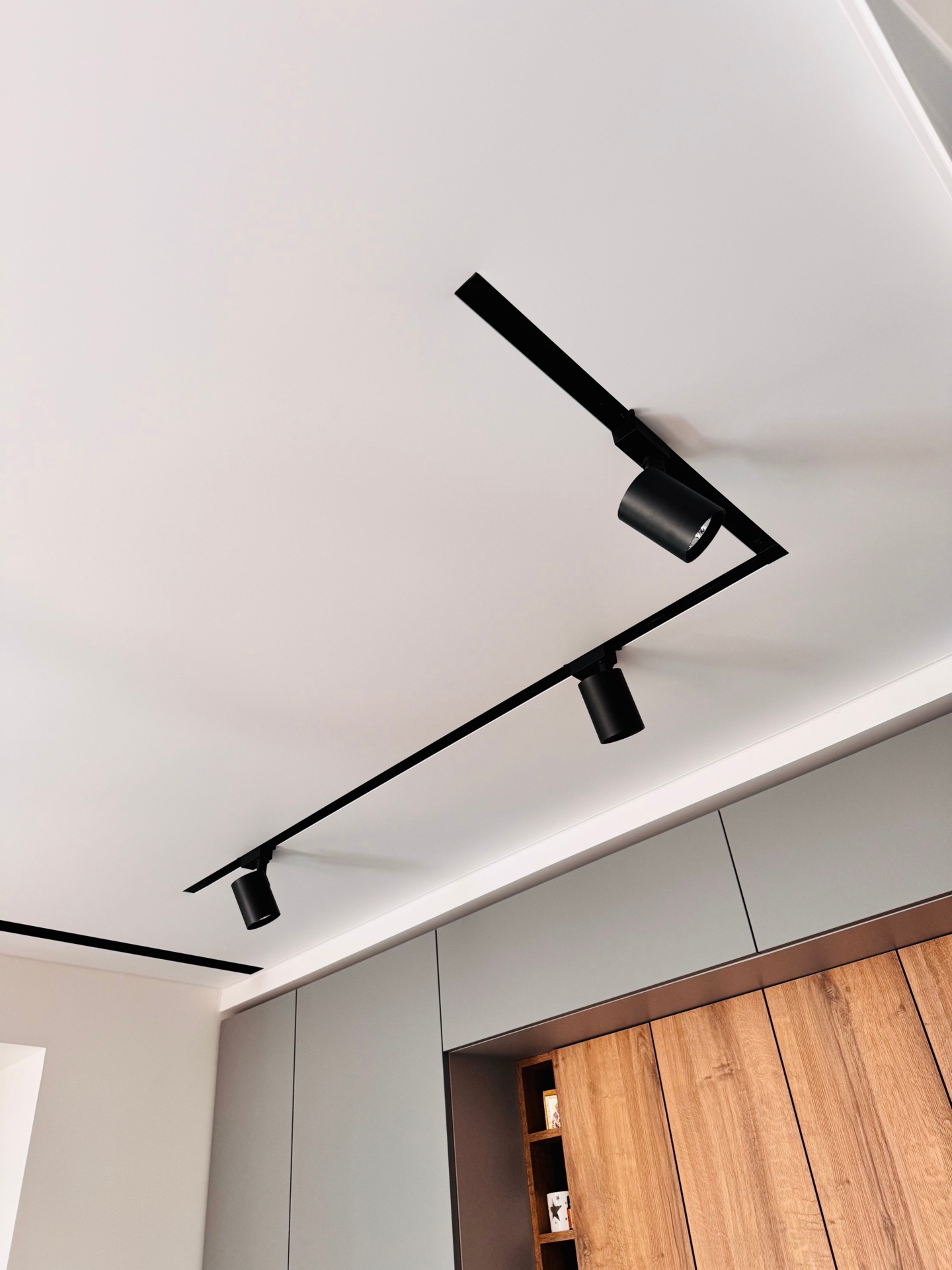 Трековые системы сейчас часто рассматривают для натяжных потолков, особенно в современных интерьерах, кухнях-гостиных, больших комнатах и пространствах со смешанными функциями. Их сильная сторона — гибкость. Свет можно направлять, акцентировать, перераспределять, а сам шинопровод позволяет собрать более живую схему освещения, чем обычные точки.