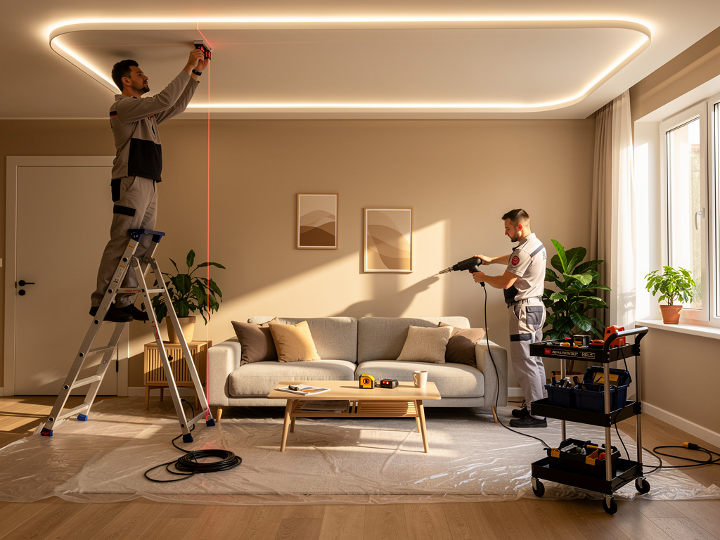 Стандарт — опускание на 3–5 см. Хотите многоуровневый? Плюс 10–15 см на уровень, но с подсветкой это оправдано. В низких потолках (2,5 м) — строго одноуровень, парящий край.