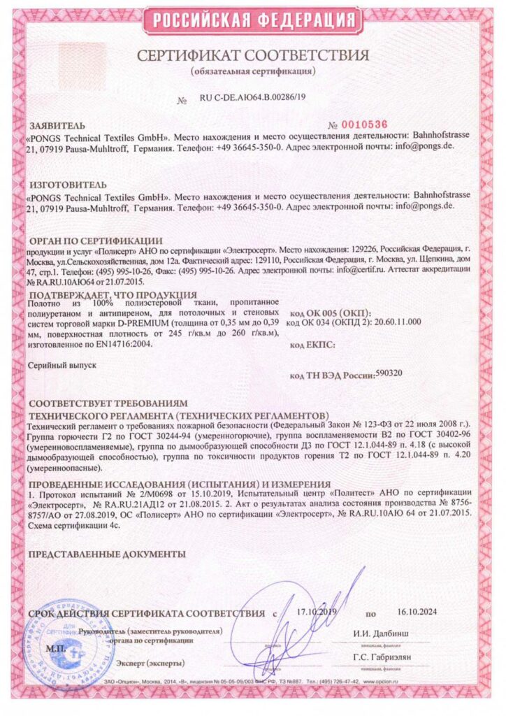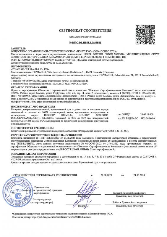 Бренд Descor родом из Германии. Ключевая особенность — тканевое полотно на базе полиэфирного волокна Trevira CS с пропиткой, формирующей стабильную геометрию, глубоко матовую фактуру и стойкость к воспламенению. Благодаря молекулярным свойствам Trevira CS материал относится к классу самозатухающих: в случае внешнего пламени он не поддерживает активного распространения огня.