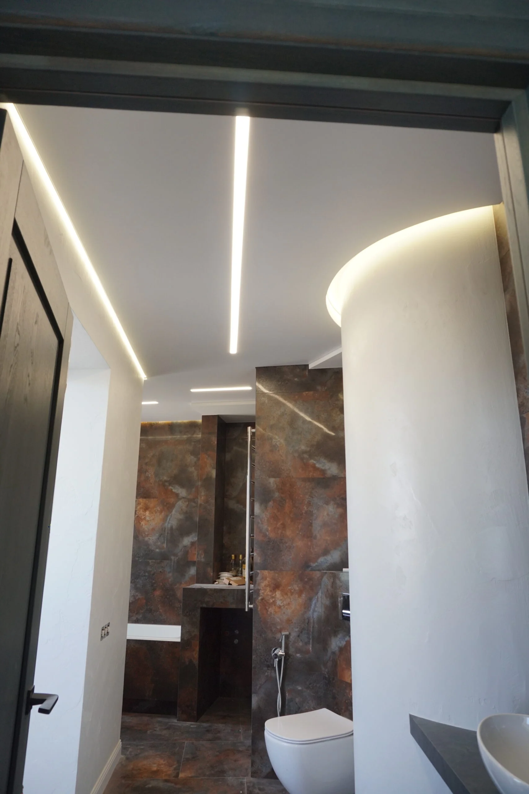 • Ниша под шторный карниз (для совмещённого санузла) — аккуратная интеграция текстиля.