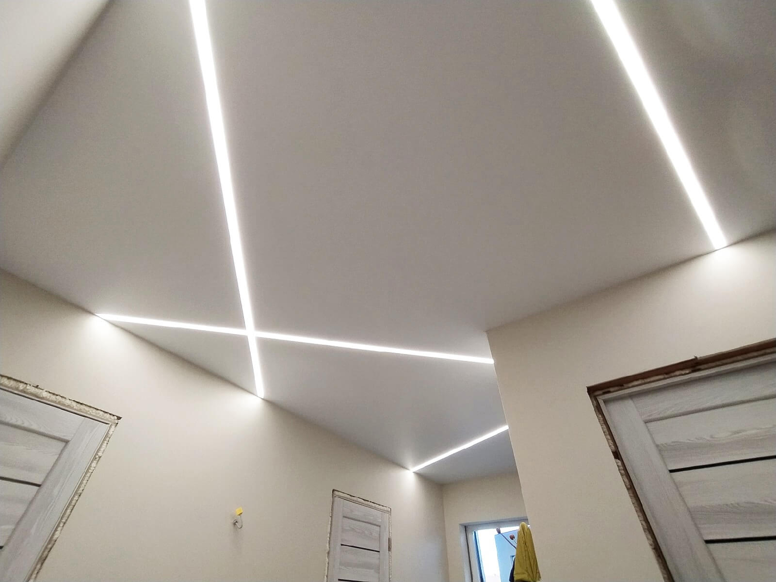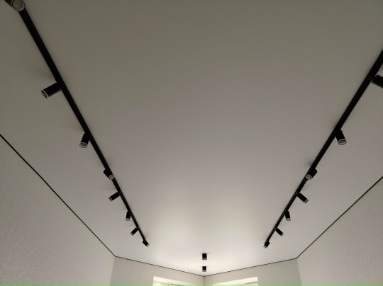 Минимально — от 25–35 мм под стандартный профиль и полотно. При встройке света и треков высота зависит от корпуса светильников и закладных: обычно 50–80 мм. Для световых линий/нишевых решений рассчитывают индивидуально. Если критичен каждый сантиметр, применяют низкий профиль, накладные светильники или внешние треки.