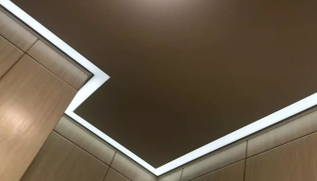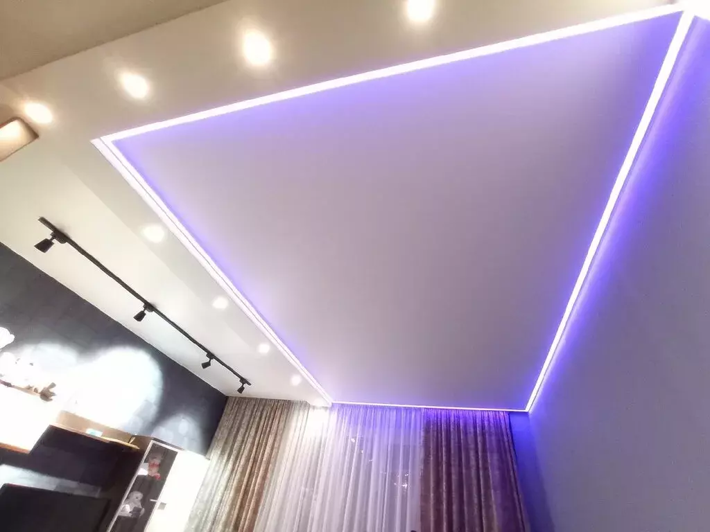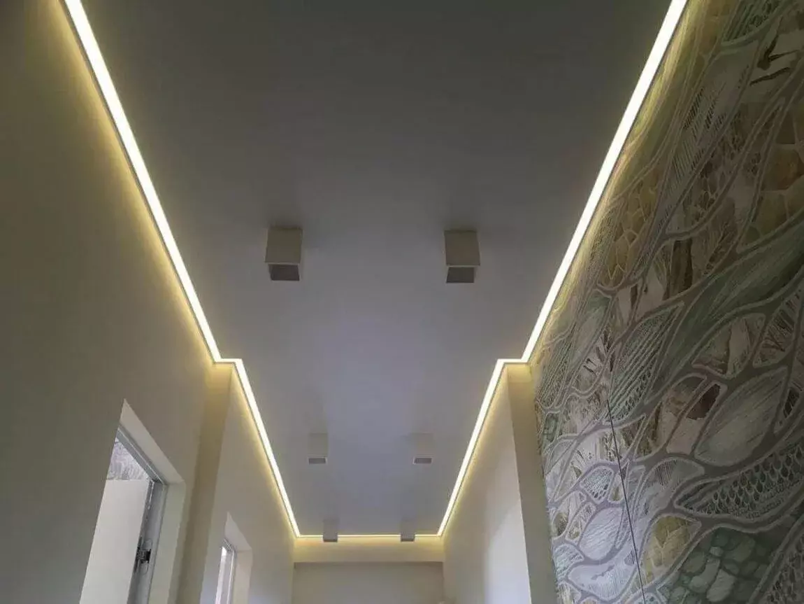 Контурная подсветка — это врезной/пристыковой профиль с нишей под LED-ленту и рассеиватель, формирующий сплошную линию света вплотную к полотну. Стена и потолок визуально «замкнуты», нет открытой щели по периметру. В отличие от парящего потолка, где намеренно оставляют зазор 10–20 мм и подсвечивают стену, контурный вариант выглядит завершённо и минималистично даже при выключенном свете.