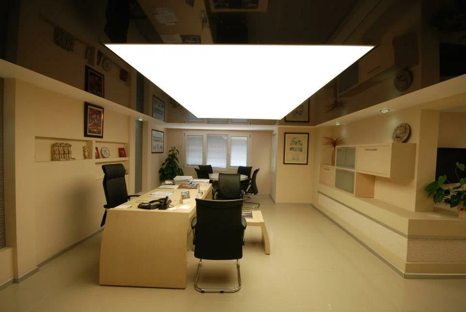 - Полная засветка — потолок светится целиком, создавая ровный световой объём в помещении.