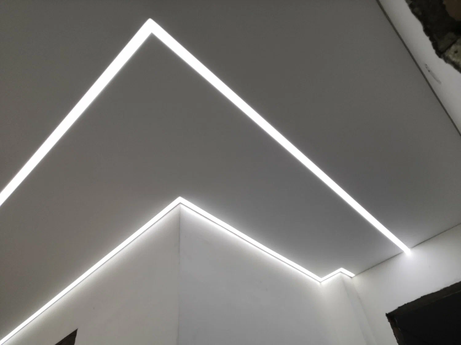 - Система создаёт эффект «парящего» потолка за счёт сочетания зазора и подсветки.